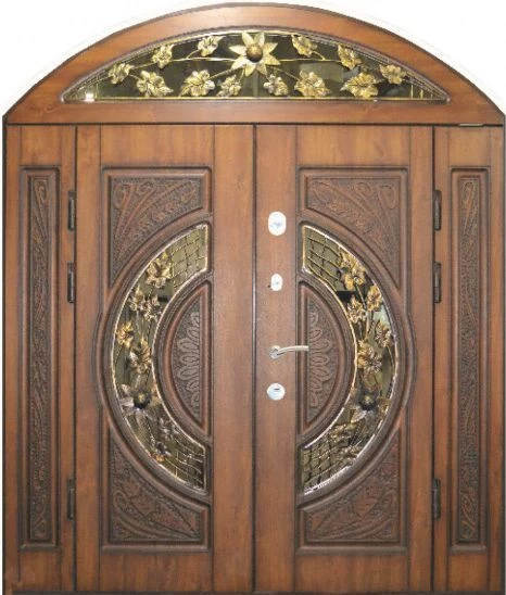 Поскольку в большинстве случаев устанавливаемые на входе в коттедж двустворчатые двери являются еще и предметом интерьера, украшающим здание, их дизайну предается особое значение. Эти двери, как правило, отделываются атмосферостойким МДФ, натуральным шпоном, массивом. Эффектно на таких дверях смотрится витражный узор, применение ковки, зеркальных элементов. Вариантов декора входной двустворчатой двери масса, тут все зависит от пожеланий заказчика.